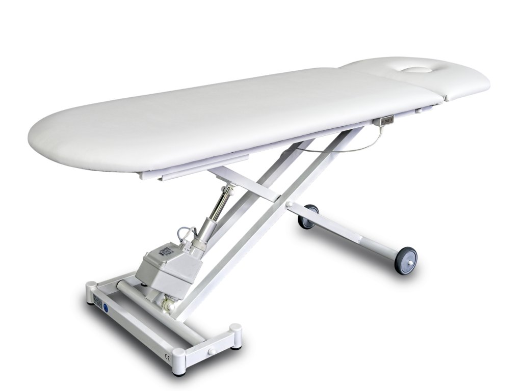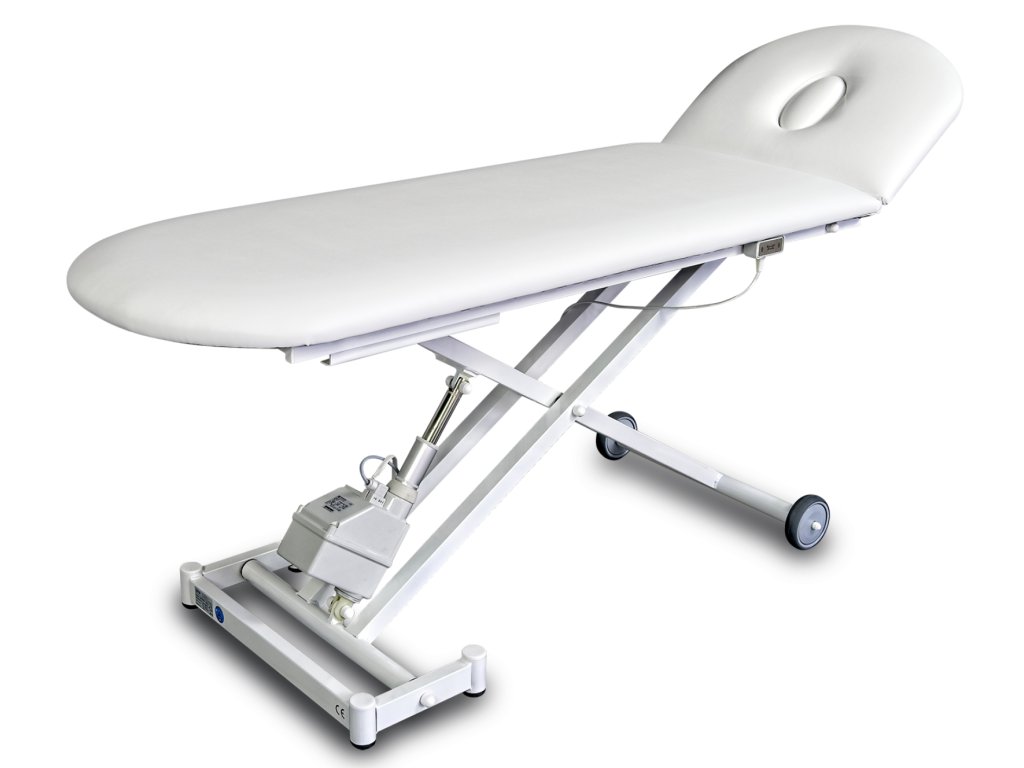 Jednomotorové dvousegmentové lehátko s jednoduchou konstrukcí s elektrickým nastavením výšky v ose stolu.