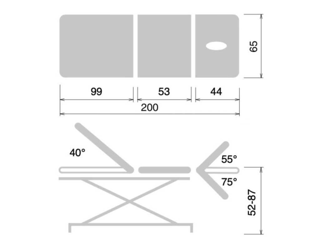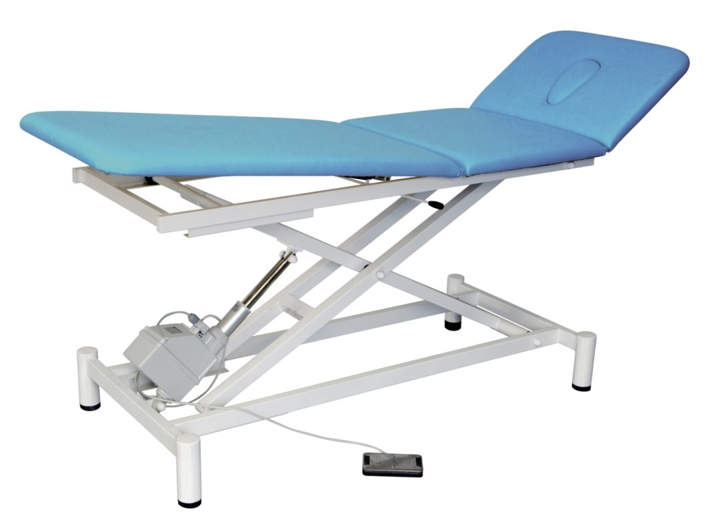Jednomotorové třísegmentové lehátko s jednoduchou konstrukcí s elektrickým nastavením výšky v ose stolu. 200 x 65 cm